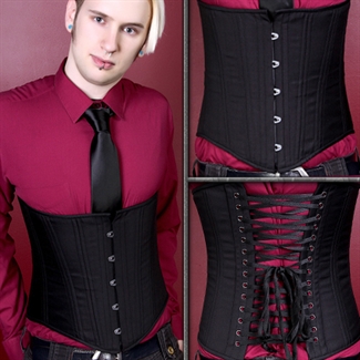 This men’s corset is jet-black and gives a smooth line over and under clothing. The cut of these men’s corsets is slightly less curvy than a women’s standard corset, as it’s designed to accommodate a larger ribcage, narrower hips and flatten the abdomen rather than create an hourglass silhouette.